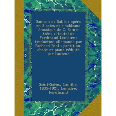 Enjoy you are read it. Samson Et Dalila : Opera En 3 Actes Et 4 Tableaux /musique De C. Saint-Saens ; [texte] De Ferdinand Lemaire ; Traduction Allemande Par Richard Pohl ; Partition, Chant Et Piano Reduite Par L Auteur PDF ePub Kindle book, let's get read or download it because available in formats PDF, Kindle, ePub, iPhone and Mobi also.
